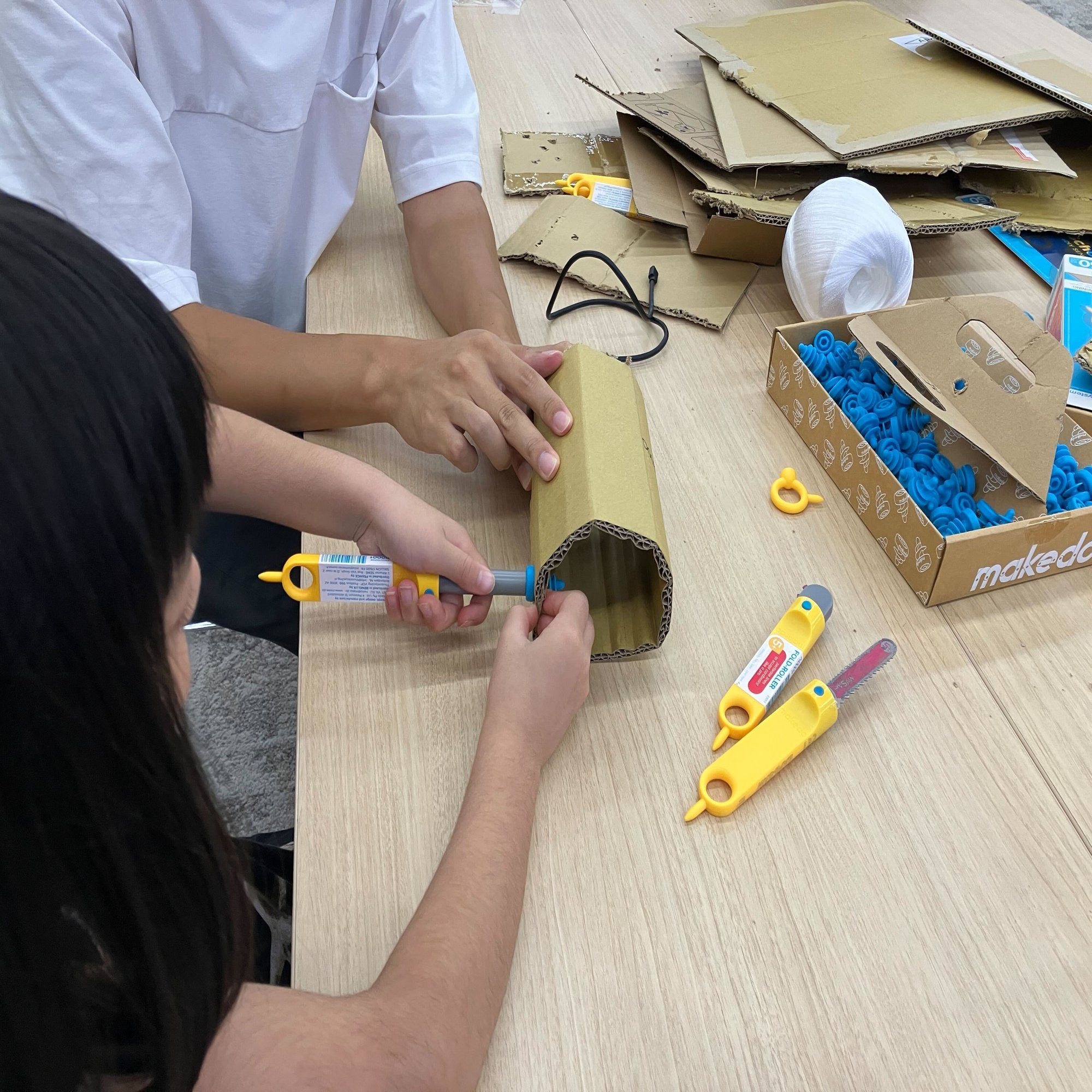 またプログラミングゾーンでは、実際にゲームで使われている角度センサーをプロックエディタに書き込み、グラフモニターで動きを見てもらいました。コントローラー工作ゾーンでは、手を切らないように注意を呼びかけながら、段ボールを切ったり、ネジで止めてオリジナルのコントローラーを一生懸命作ってくれました。